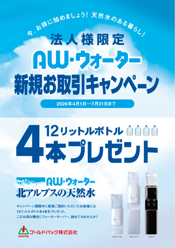 法人様限定で、新規登録がオトクなAW・ウォーター北アルプスの天然水「新規お取引キャンペーン」を期間限定で実施中です。